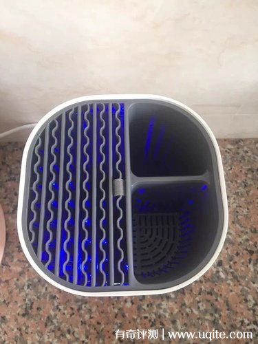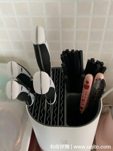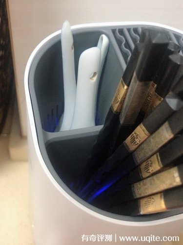 消毒機(jī)雖然是塑料的材質(zhì),但是質(zhì)量還挺好的。消毒機(jī)一共三個(gè)區(qū)域,其中一半的區(qū)域是用來(lái)放刀的,梯形的設(shè)計(jì),將刀插進(jìn)去會(huì)很穩(wěn)定。另外一半有分為了兩個(gè)小格,可以用來(lái)放筷子、勺子、叉子之類的物件。