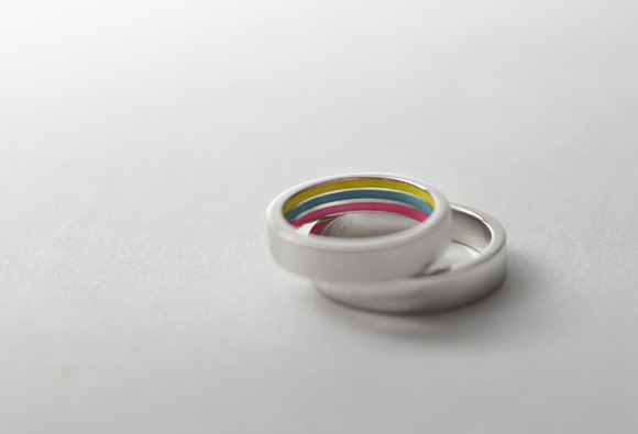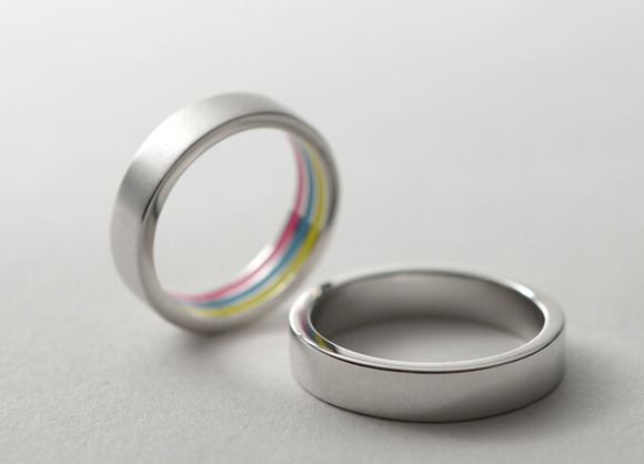 這是一對由香港珠寶品牌INNO.PARK最新推出的彩虹愛情戒指。一對對戒有兩種截然不同的款式,男方的便是普通的貴金屬戒指,而女方的戒指除了貴金屬之外,設(shè)計師在戒指的內(nèi)側(cè)嵌有彩虹一般的花紋圖案,并用鉑金鑲邊,看上去非常的精美,原本簡約的設(shè)計瞬間升華了幾個檔次。