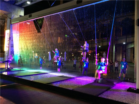在波士頓公園里,有一個(gè)由20個(gè)點(diǎn)亮的環(huán)形秋千組成的互動(dòng)式游樂設(shè)施。它內(nèi)置LED燈源,并由加速度計(jì)控制,當(dāng)秋千處于靜止?fàn)顟B(tài)的時(shí)候,它們會(huì)發(fā)出微弱的白光,當(dāng)秋千被晃動(dòng)的時(shí)候,白光就會(huì)轉(zhuǎn)換成紫色的光。環(huán)形的秋千有三種不同的尺寸,可以供人們休息和鍛煉。