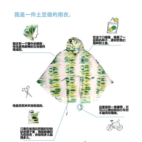 土豆除了用來炸薯?xiàng)l,還可以做什么?西班牙設(shè)計(jì)公司Equilicuá給出了最具創(chuàng)意的答案——制作雨衣。他們用馬鈴薯淀粉研發(fā)出了一款可生物分解的塑料,簡單的造型可愛又環(huán)保。全系列商品均獲得Ecolabel歐盟生態(tài)環(huán)保標(biāo)章認(rèn)證,并榮獲2013/2014歐洲綠色設(shè)計(jì)獎(jiǎng)亞軍等殊榮。