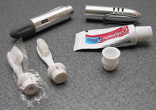 言歸正傳,扭開“筆帽”,是牙膏填加口,我們要用的牙膏,就由這兒擠進去,(類似于給鋼筆灌墨水),遺憾的是容量小了點兒,只夠刷三次牙的。當然,出門在外,將陋就簡,也夠支持幾天的了。再擰開“筆尖”,就是牙刷了,牙膏由中空的牙刷柄擠出,就可以,開刷了!