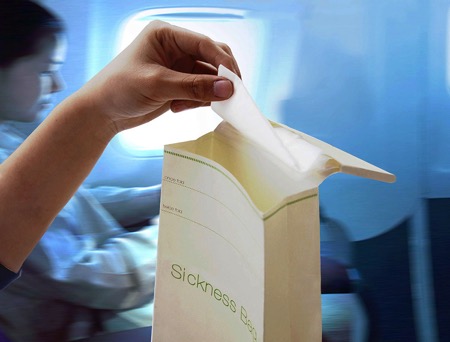 飛機或火車上的嘔吐袋方便了不少暈車的人,這款新式嘔吐袋在開口處提供了擦嘴紙巾,貼心的設(shè)計可大大降低在公共場所不雅的尷尬感。