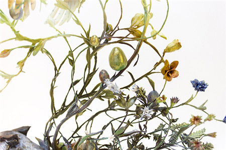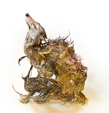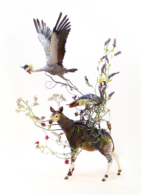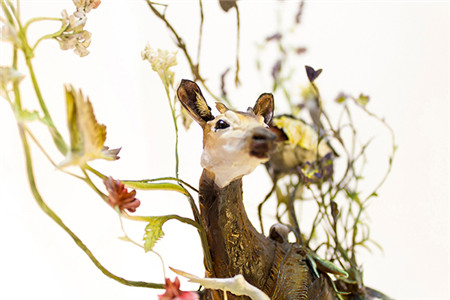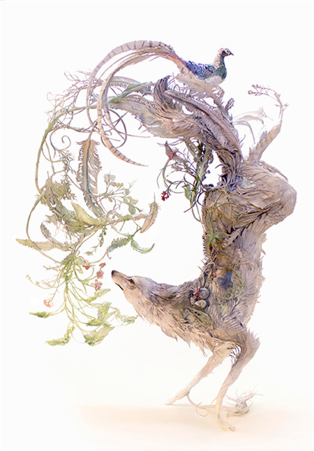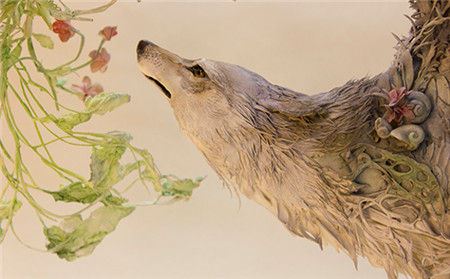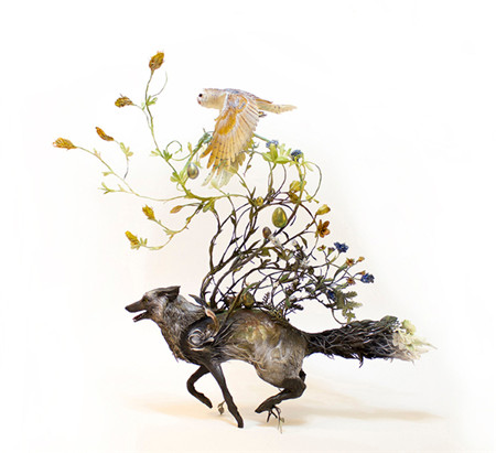 加拿大雕塑家 Jewett 創(chuàng)造出了一系列猶如神話世界的作品。組合動物與植物,有狼、花、鳥、魚等,純手工打造,顏色自然,細節(jié)栩栩如生,玄幻逼真,動感十足。