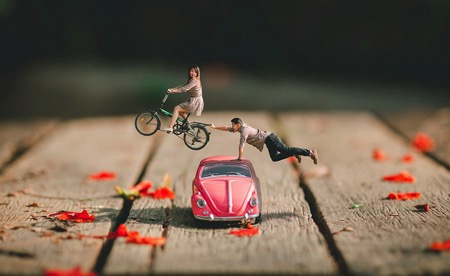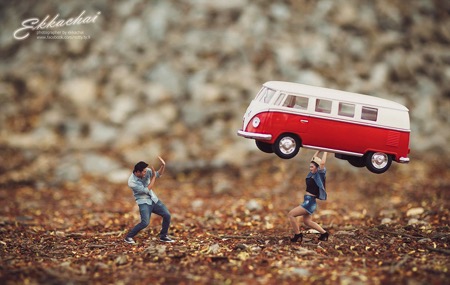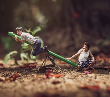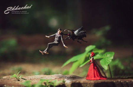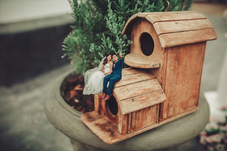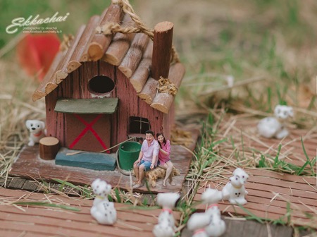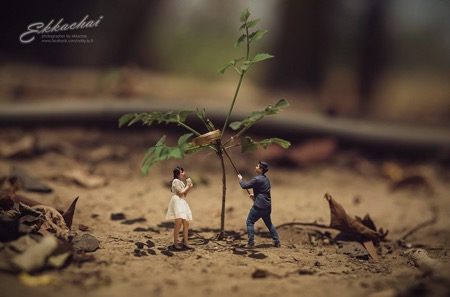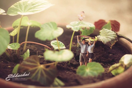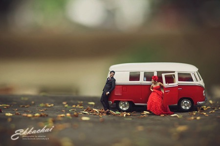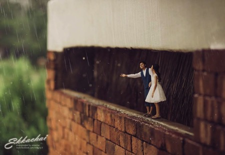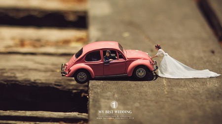 千篇一律的婚紗照早就難入都市00后的眼界啦。Ekkachai Saelow 用圖片處理技術(shù)和移軸攝影為新人們設(shè)計(jì)了一套趣味婚紗,里面的場景和道具都是我們平時(shí)需要蹲下身來拿著小放大鏡看的呢,新人們就像是來自小人國的國民,好有意思~