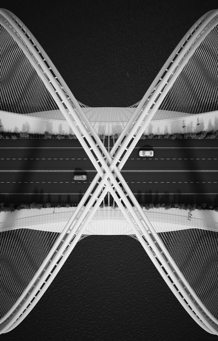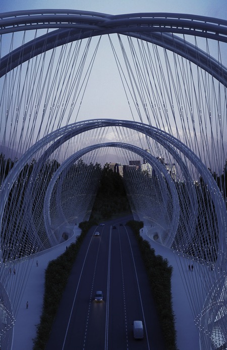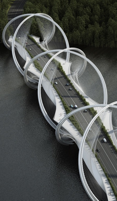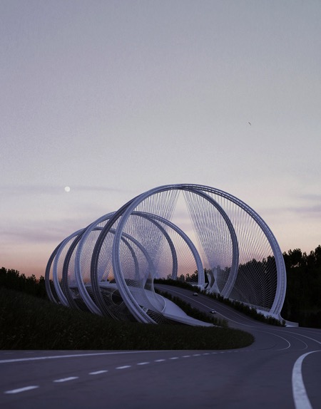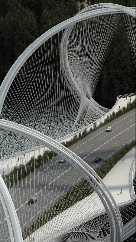 三山大橋橫跨媯河,是2022北京冬季奧林匹克運動會基礎(chǔ)設(shè)施的組成部分,將市中心和張家口聯(lián)系起來。三山的文字意思是指三座山,這也說明了從側(cè)面看時橋梁的造型,即:三個拱形結(jié)構(gòu)連接了起伏的山巒。大橋地處北京高密度的市區(qū)與城市北側(cè)跌宕河谷之間的門戶位置。大橋周邊地區(qū)作為休閑場所,在居民和游客中的人氣指數(shù)快速上升。在前往北京冬奧會的所有主要室外賽事舉辦地張家口的途中,這座大橋在山巒層疊的景觀中成為一座引人入勝的雕塑。