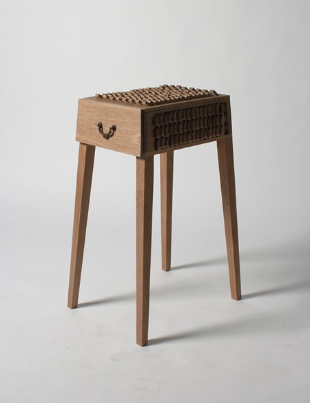 Pull me to live 是一款帶有特殊外表面的抽屜。當(dāng)抽屜關(guān)閉時(shí),外表面多塊鱗片呈閉合狀態(tài),排列整齊,造型奇特;而當(dāng)抽屜被拉開時(shí),外層鱗片逐排張開翻轉(zhuǎn),直至轉(zhuǎn)到相反的方向,使得鱗片背面顏色顯露出來,仿佛在拉動(dòng)抽屜的同時(shí)完成了“變色”一般。這種逐步“變形”的方式創(chuàng)造出一種抽屜能夠?qū)ν饨绱碳ぷ龀龇磻?yīng)的感覺,仿佛抽屜是個(gè)活生生的動(dòng)物一般。同樣當(dāng)抽屜關(guān)閉推回原位時(shí),外表面又變回本來的顏色。