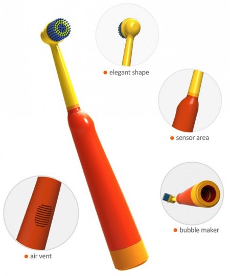 為了要小孩子們養(yǎng)成刷牙的好習(xí)慣,設(shè)計(jì)師設(shè)計(jì)了一款吹泡泡牙刷,它內(nèi)置的芯片能檢測到牙刷的運(yùn)動狀態(tài),只要小朋友采取正確的刷牙姿勢,牙刷尾部就會吹出泡泡,以示鼓勵(lì)~