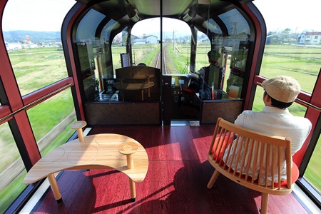 日本ICHIBANSEN 推出了名為“echigo TOKImeki resort setsugekka”的本地觀光列車。該趟列車從新瀉縣西部出發(fā),并對(duì)部分墻壁進(jìn)行了車窗改造,形成絕妙非凡的觀光視野。全車僅包括兩節(jié)車廂和45個(gè)座席,其中第一節(jié)車廂完全用于觀光,而第二節(jié)車廂則設(shè)有一間法式餐廳。內(nèi)部車廂家具以日本國內(nèi)天然木材制作,而餐廳的食物,同樣選擇當(dāng)?shù)厥巢臑樵稀?