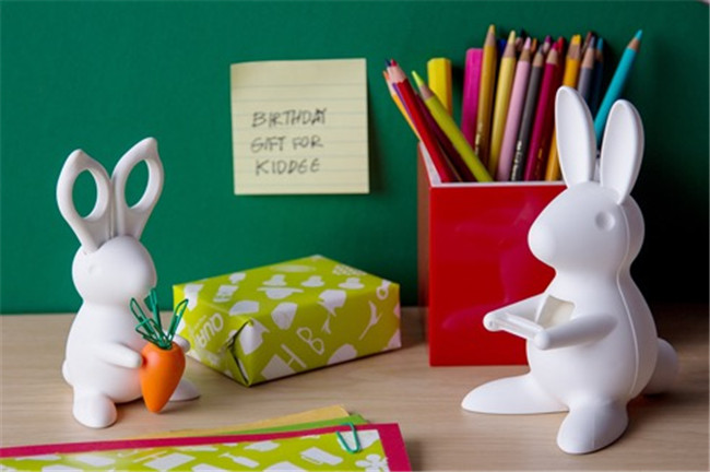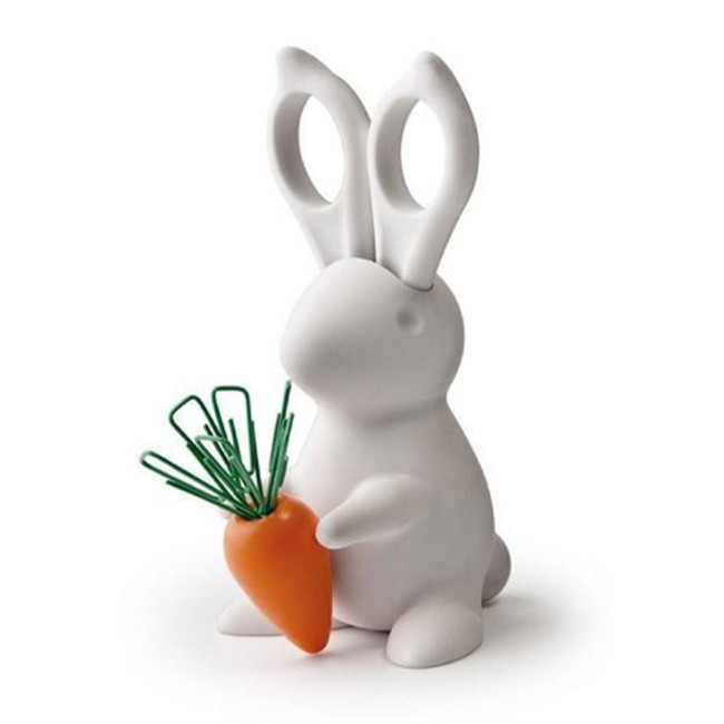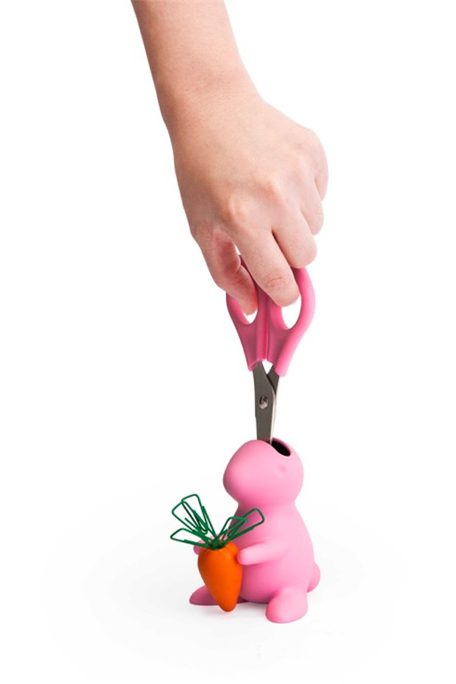 這是一套可愛的辦公用具,剪刀是兔子的耳朵,兔子手中的胡蘿卜上則可以吸附曲別針,猶如胡蘿卜的葉子,非常個(gè)性。只是,取出剪刀之后,小兔兔顯得很是可憐呦。