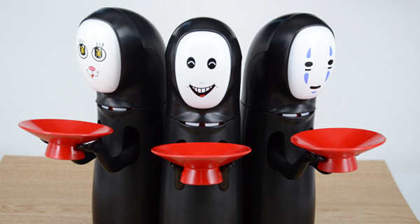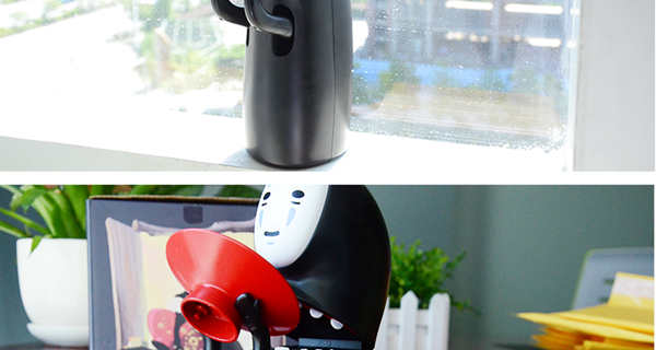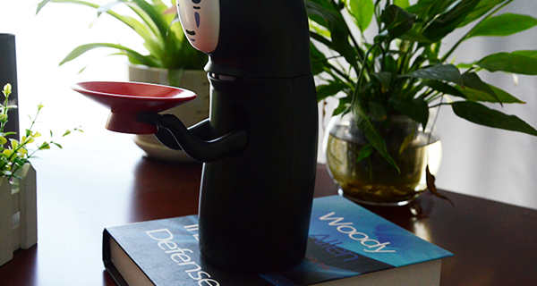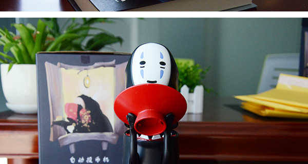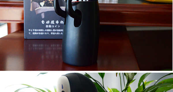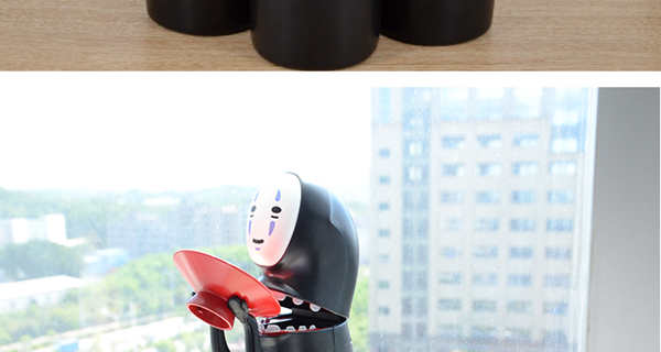 無臉男存錢罐手里托著一個紅碗,就是電影中他狂吃東西的那個碗。當在碗里放上硬幣后(重量大于30g),無臉男就會“啊~”的慢慢把硬幣倒進嘴里,吃完后還會有一聲打嗝~簡直萌到不行~