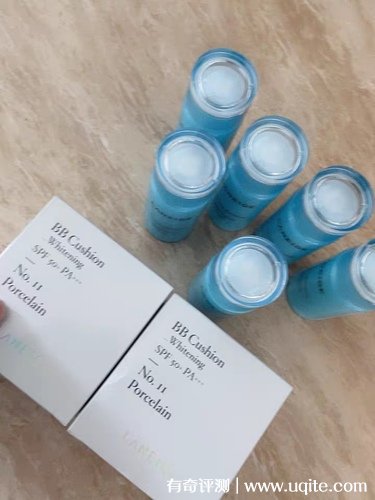 蘭芝氣墊到手之后送了很多水乳小樣,還有替換裝,感覺還蠻劃算的,這款氣墊的色號不多,只有兩個色號,我買的是11號亮白色,顏色很自然,不會假白。