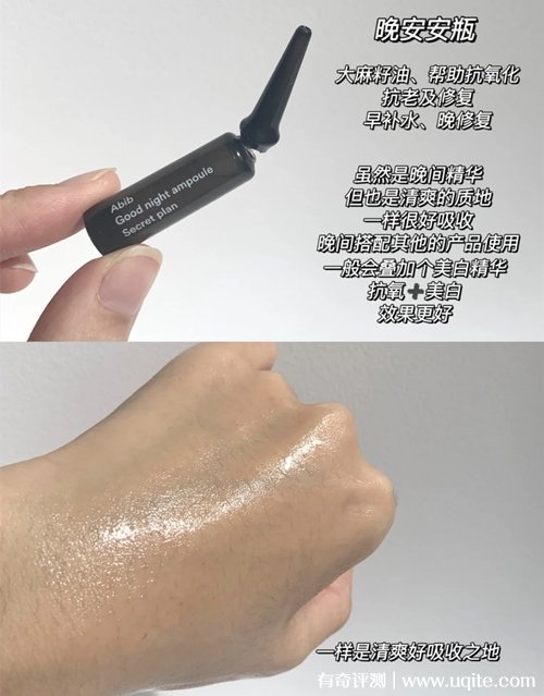 abib晚安精華的質(zhì)地跟早安精華差不多,稍微要粘稠一點(diǎn),就給人一種很滋潤很有營養(yǎng)的感覺,上臉之后需要稍微按摩按摩幫助吸收(雖然沒那么快,但是還是能完全被吸收的那種,用完就沒有黏感了),我是給它當(dāng)乳液用的,用完臉上軟軟的,保濕也很夠,隔天醒來臉上不油膩。