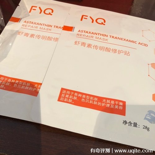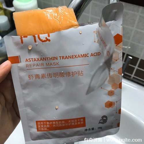 這款敷益清面膜一盒是五片裝,拆開之后,里面的面膜材質(zhì)就還挺輕薄的,而且精華液很多,是橙黃色的,面膜聞起來有點點酸味,這應(yīng)該就是蝦青素傳明酸的味道。