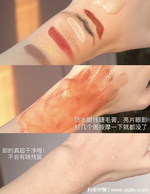 這款卸妝乳的卸妝力還蠻強的,像粉底、眼影這些卸的毫無壓力,就連我用的防水超級難卸的眼線筆、睫毛膏也可以很輕松的卸下來,它乳化的速度也蠻快的,沾點水就全部乳化成乳白色了。
