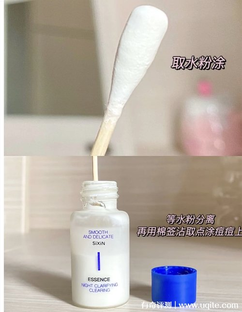 SIXIN私信祛痘水是水粉分離的設(shè)計,上面是液體,下面是白色的粉末,稍微靜置一會就會看見很明顯的分層(用的時候不要搖晃),它的用法很簡單,直接拿棉簽蘸取最下面的白色粉末點涂在長痘痘的地方,只需要涂在長痘痘的地方,不用全臉涂。