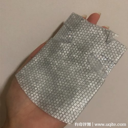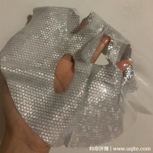 Fan Beauty冰鉆面膜的膜布拿出來之后是銀白色的,顏值還蠻高的,面膜的表面是由一顆顆閃閃的銀色小圓點(diǎn)組成的,看著真的有點(diǎn)像一顆顆小鉆石一樣。面膜的材質(zhì)比較厚實(shí),但貼在臉上還蠻透氣的,很貼緊皮膚,不會(huì)往下掉,大小裁剪的也很好。