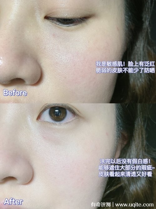 曼秀雷敦新碧防曬霜用完之后稍微帶一點(diǎn)潤色的效果(不存在假白、泛白的情況),用完后整體膚色均勻了很多,臉上的一些瑕疵都被遮蓋住了一點(diǎn),毛孔看著也隱形了點(diǎn),有種天生好皮的感覺。