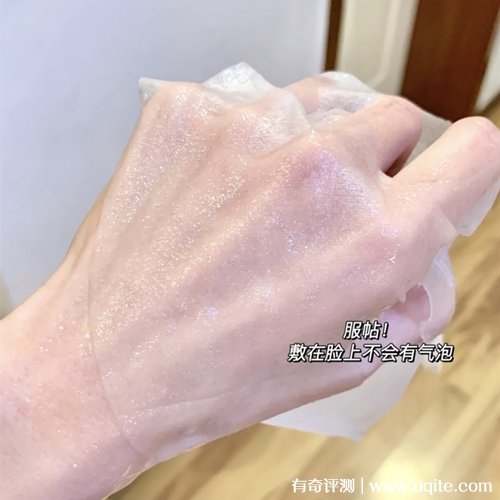 女神之美面膜的膜布紙還蠻薄的,但不是那種容易變形的類(lèi)型,摸著滑滑的,很柔軟,上臉?lè)粣?,剪裁什么的也蠻合理。它里面精華含量很多,膜布拿出來(lái)后還有多的,精華質(zhì)地是稠的,但不算粘膩,吸收感明顯,能感覺(jué)到膜布在臉上越來(lái)越干。