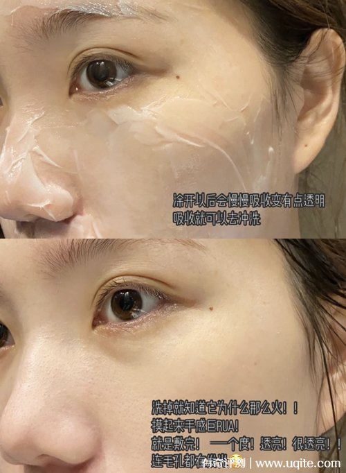 這款面膜我一般都是敷20-30分鐘左右,敷的時候會比較久一點,(薄涂的話就不用洗了)在洗的時候我一般都是先用浸濕的洗臉巾擦一遍,然后再用清水洗干凈就可以了,洗完之后皮膚很水嫩透亮,沒有什么油膩感。