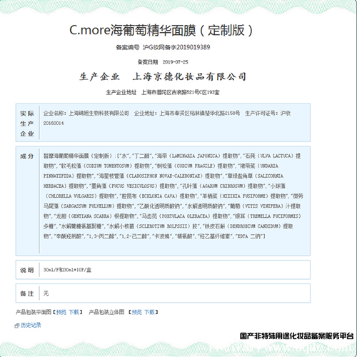 皙摩(C.MORE)隸屬于上海京德化妝品有限公司旗下,是一家集研發(fā)、生產(chǎn)、銷售、服務(wù)于一體的綜合性合資企業(yè),該品牌通過融合領(lǐng)先的生物、生化基因工程技術(shù),致力于研發(fā)滿足消費(fèi)者所需要的各項(xiàng)原液護(hù)膚產(chǎn)品。其中皙摩海葡萄面膜精華面膜就是他們家很火的一款產(chǎn)品,在成分安全方面是獲有國(guó)妝特字編號(hào)認(rèn)證的,可以放心使用,下面就來具體看看這款皙摩海葡萄面膜怎么樣。