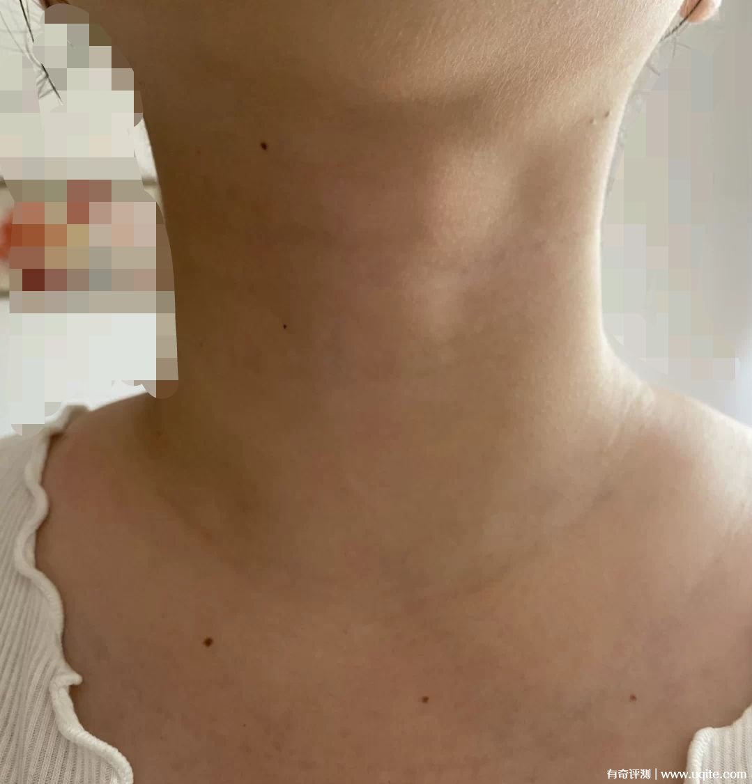 至于淡紋方面,還挺不錯的,用半罐的時候就感覺有淡化一些,現(xiàn)在用第二罐了,比較新一點、本身淺一點的頸紋已經(jīng)都不怎么明顯了,就是最下面那條沒太大作用。