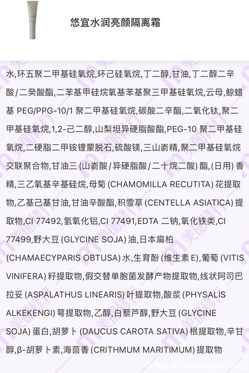 unny妝前乳的包裝不錯(cuò),打開之后它的味道聞著不錯(cuò),香味淡淡的,我也在網(wǎng)上查了一下這款隔離霜的成分,還是蠻溫和的,我用完之后臉上也沒有出現(xiàn)悶痘的情況。