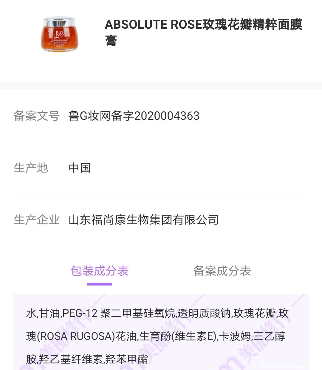 最近平陰玫瑰花面膜膏的風(fēng)還挺大的,是惠農(nóng)玫瑰產(chǎn)的,正品名稱是absolute rose,右上角有大寫TM標(biāo)志,生產(chǎn)廠家為山東福尚康生物集團有限公司,價格在200元—300元左右,天貓店鋪也不一定是原版,有很多仿冒品牌,大家要注意辨別。產(chǎn)品不含香精、酒精、礦物油以及其他風(fēng)險成分,是安全的靠譜的。下面就一起來具體看看用戶關(guān)于平陰玫瑰花面膜膏的使用體驗。