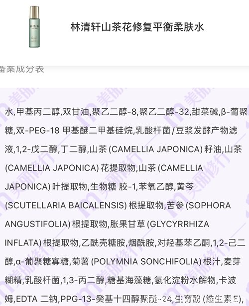 林清軒山茶花柔膚水到手之后還送了很多贈品小樣,它打開之后味道聞著不錯,香味淡淡的,我也在美麗修行APP上查了一下它的成分,還是蠻溫和的,沒有添加什么防腐劑,就算是敏感肌用著也沒啥問題。