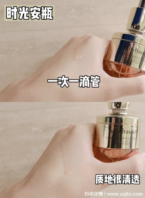 雪花秀時光安瓶的質(zhì)地流動性很強,看著有點粘稠,但上臉還是比較清爽的,抹開就能感受到它的滋潤度(如果皮膚是油皮或者是混油,可以現(xiàn)在掌心搓熱,然后按壓上臉)。不粘膩,吸收也還挺快的,用完后感覺在皮膚表面形成了一層膜一樣,摸著嫩嫩的,很有水分感,后續(xù)不油膩,不搓泥。
