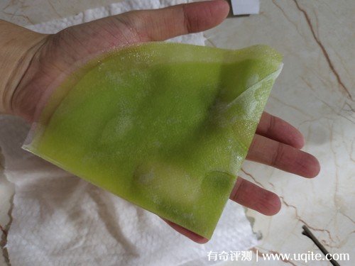 面膜到手后,就還挺大一盒的,它里面一共是十片裝,感覺性價比是真的很高。拆開使用時,這款原辰吊瓶面膜的襯布是綠色的,里面的精華液還挺多,并且沒有過重的粘膩感,敷在臉上就還蠻清爽的。