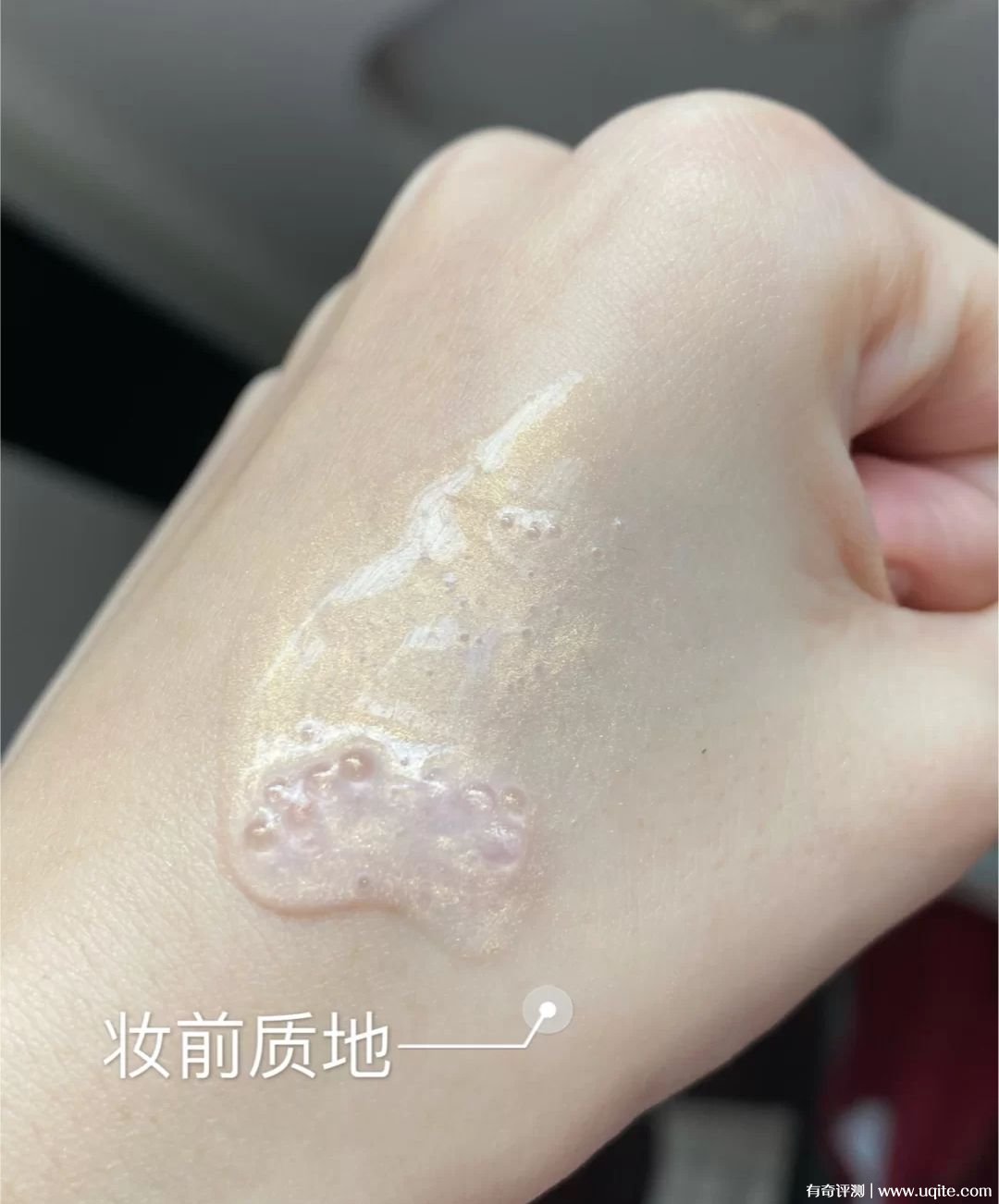 質(zhì)地水水潤(rùn)潤(rùn)的,有金粉細(xì)閃,里面還有爆珠,在上手揉搓可以化開,不過我覺得這個(gè)爆珠麻煩了點(diǎn)。整體上臉延展性不錯(cuò),吸收挺快的,后續(xù)不粘膩不搓泥。上粉底液也很服帖,保濕力贊。