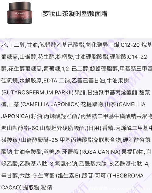 夢妝山茶凝時塑顏面霜到手之后還送了一些贈品小樣,感覺還蠻不錯的,面霜打開之后香味淡淡的,聞著也不刺激,我還在網(wǎng)上查了一下它的成分,還是蠻溫和的,沒有添加什么刺激性的成分,用著也還蠻溫和的。