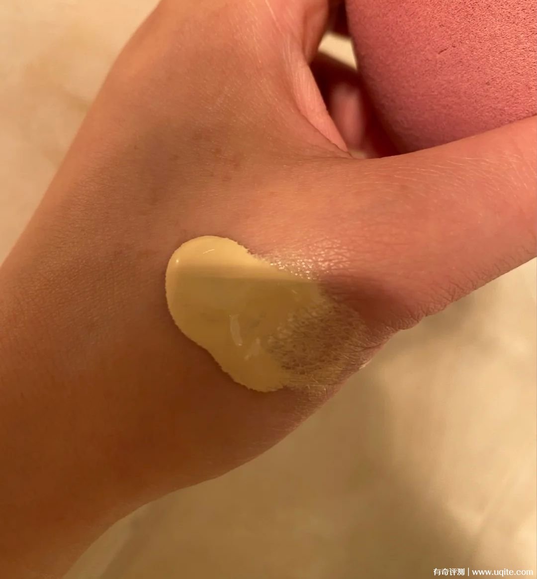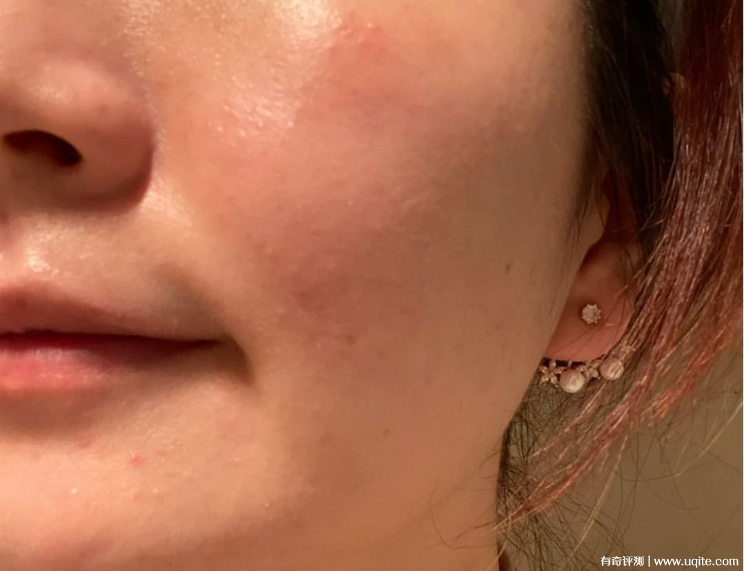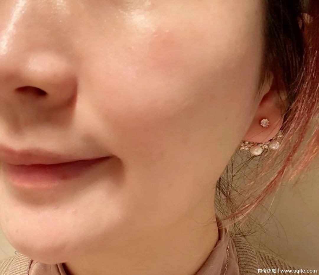 顏色來說還是比本身膚色白不少的,不過因?yàn)檩p薄通透,所以不顯得假。我本來臉上泛紅明顯,還有不少小瑕疵,用了后小瑕疵被淡化不少,泛紅也被遮住七八成,遮暇算中等吧。