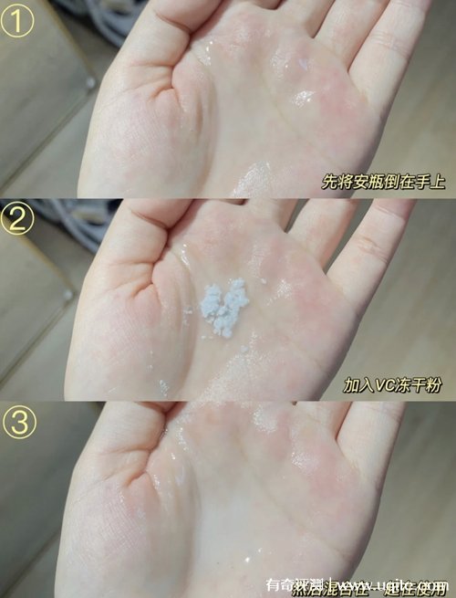 galenic科蘭黎抗氧1號VC精華的使用方法也很簡單,先將安瓶倒在手心,然后加入vc凍干粉,混合均勻就可以使用了(精華分量很足,一小瓶可以用三次)?;旌现笏馁|(zhì)地很清爽,上臉不黏膩,吸收也可以。