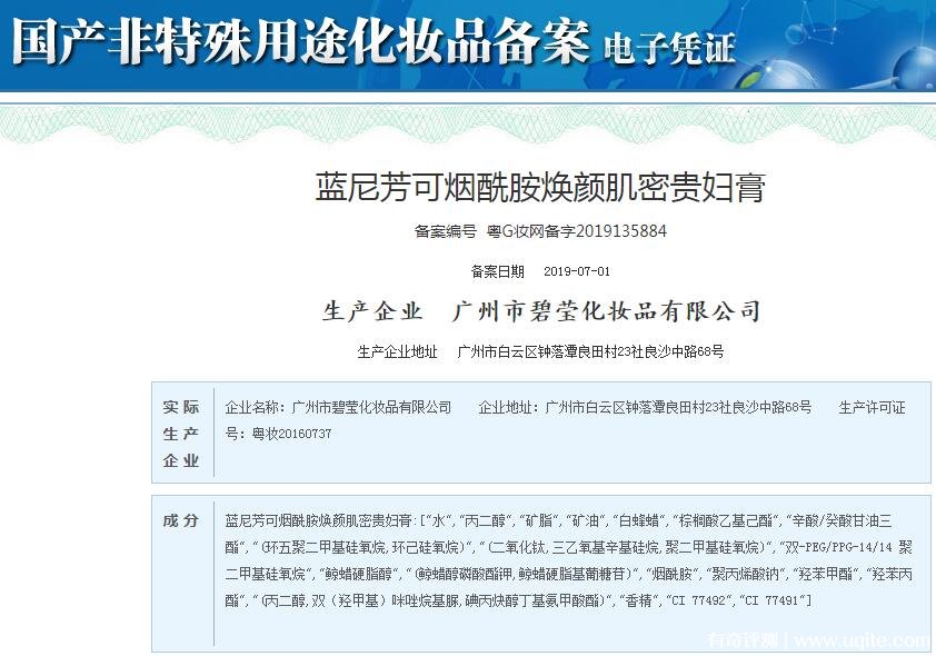 對(duì)于藍(lán)尼芳可這個(gè)品牌,可能很多天沒聽過(guò),藍(lán)尼芳可一個(gè)國(guó)產(chǎn)三線護(hù)膚品品牌,通過(guò)國(guó)家食品藥品監(jiān)督管理局,可以查詢到“藍(lán)尼芳可”這個(gè)品牌的備案號(hào),比如藍(lán)尼芳可旗下最熱門的是貴婦膏,根據(jù)查詢(見下圖),其備案編號(hào)為“粵G妝網(wǎng)備字2019135884”,說(shuō)明這款產(chǎn)品在完全性方面沒問(wèn)題,不是三無(wú)產(chǎn)品。那么藍(lán)尼芳可這個(gè)牌子怎么樣呢?來(lái)看看其旗下最火爆的貴婦膏實(shí)際使用體驗(yàn)。