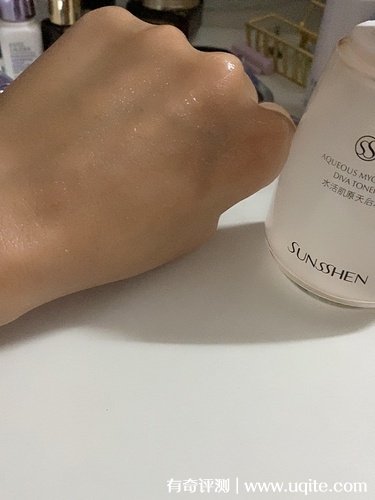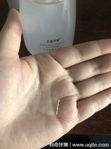 這款圣蜜萊雅天后水的包裝還挺好看的,而且按壓頭的設計,平時用起來就很方便控制使用量。這款天后水是透明的液體質地,上手使用流動性就還挺強的。