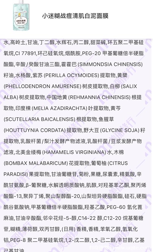 小迷糊祛痘泥膜的包裝還蠻不錯的,是袋裝的,用著還蠻衛(wèi)生的,而且我也在網(wǎng)上查了一下它的成分,還是蠻安全溫和的,沒有添加什么香精和酒精。