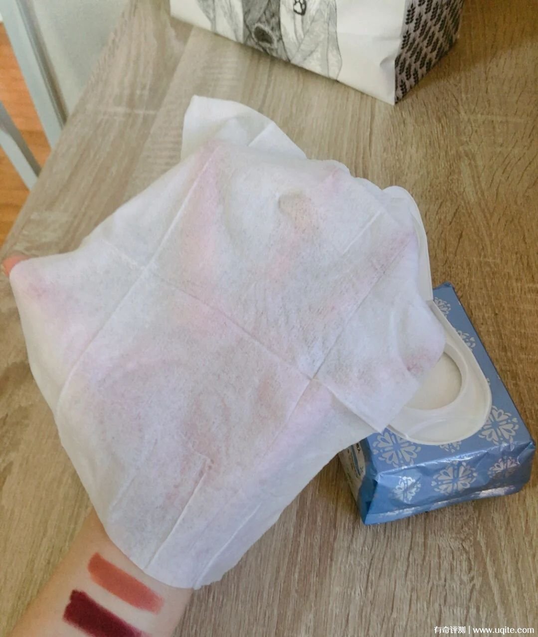 繽若詩(shī)卸妝濕巾到手兩包,很劃算,我先拆的藍(lán)色的,因?yàn)檫€有扣子,所以每次用完后扣上也不擔(dān)心干。它單張大小還挺大的,我沒畫過大濃妝,所以全臉一張綽綽有余。