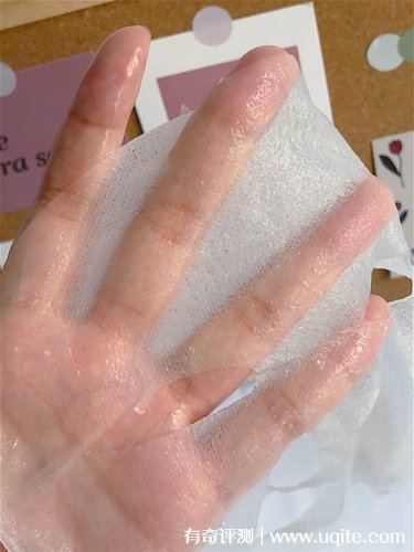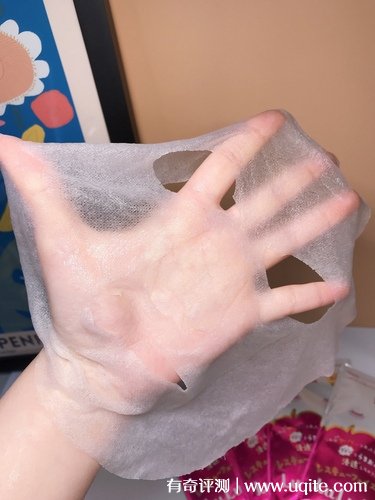 這款lululun面膜一盒是五片裝的,拆開使用時,里面的精華液很多,而且面膜布的質(zhì)地很輕薄,剪裁和質(zhì)量都很不錯,上臉敷貼拉扯以后沒有變形的情況。