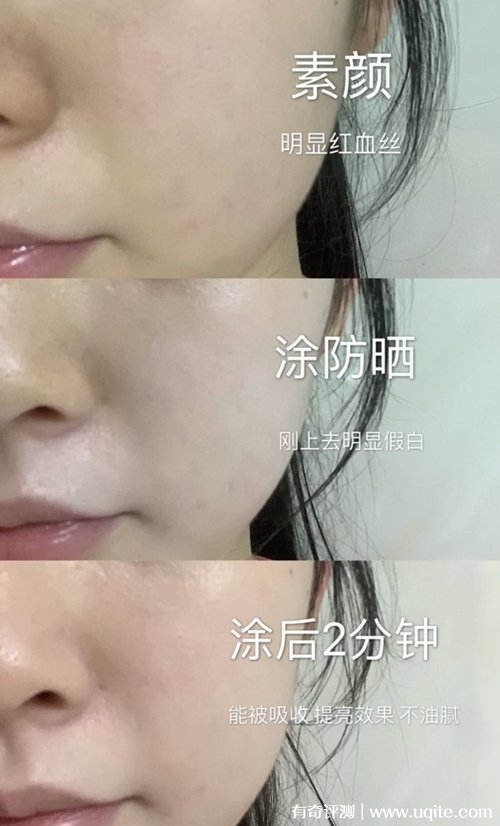 另外,這款防曬霜用完之后稍微帶一點均勻膚色的效果,但不會假白,整體膚感看著是很通透的感覺,不油。卸妝的話,可以直接用洗面奶洗,不需要額外用卸妝產(chǎn)品。