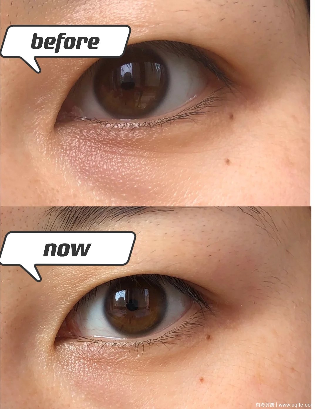 至于效果方面,我最先感受到的是緊致,用了十來天左右,感覺眼周有彈性了些。目前用了一個月左右,黑眼圈有淡化一些,甚至眼紋也淡了。
