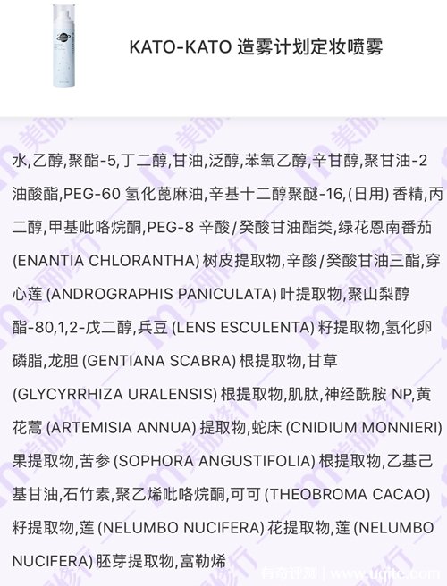 KATO定妝噴霧到手之后還送了一些贈(zèng)品,它的包裝不錯(cuò),打開之后味道很淡,我也在美麗修行APP上查了一下它的成分,還是蠻溫和安全的,沒有添加什么酒精。