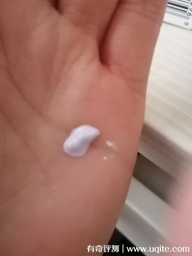 這款隔離霜有綠色和紫色兩個顏色可以選擇,其中綠色適合普通或者臉上有紅血絲的肌膚,而紫色適合膚色暗黃無光的皮膚,因為我本身膚色是偏黃的,所以我選擇的是紫色款,我先是在手上使用一下,這款隔離霜質(zhì)地算是偏厚重類型的。