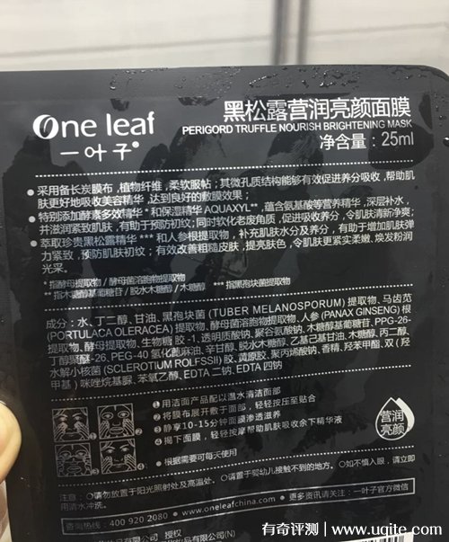 一葉子黑松露面膜打開之后它的味道挺淡的,不刺激,它是沒有添加什么香精和酒精的,所以用著也還蠻溫和的,不會過敏。