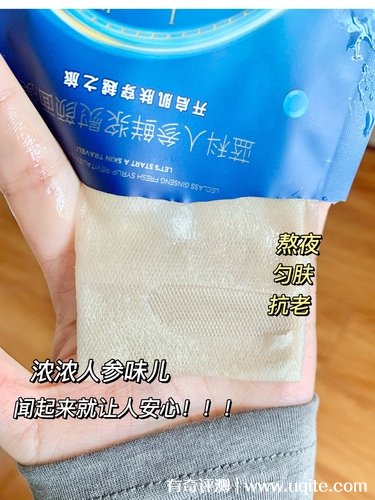 藍(lán)科面膜打開(kāi)之后味道聞著不錯(cuò),是那種人參的清香,用著很舒服,沒(méi)有過(guò)敏。它的膜布很薄,材質(zhì)很好的感覺(jué),上臉?lè)麤](méi)氣泡,透氣性不錯(cuò)。里面精華含量也挺多的,還有多余的可以抹在脖子和腿上。