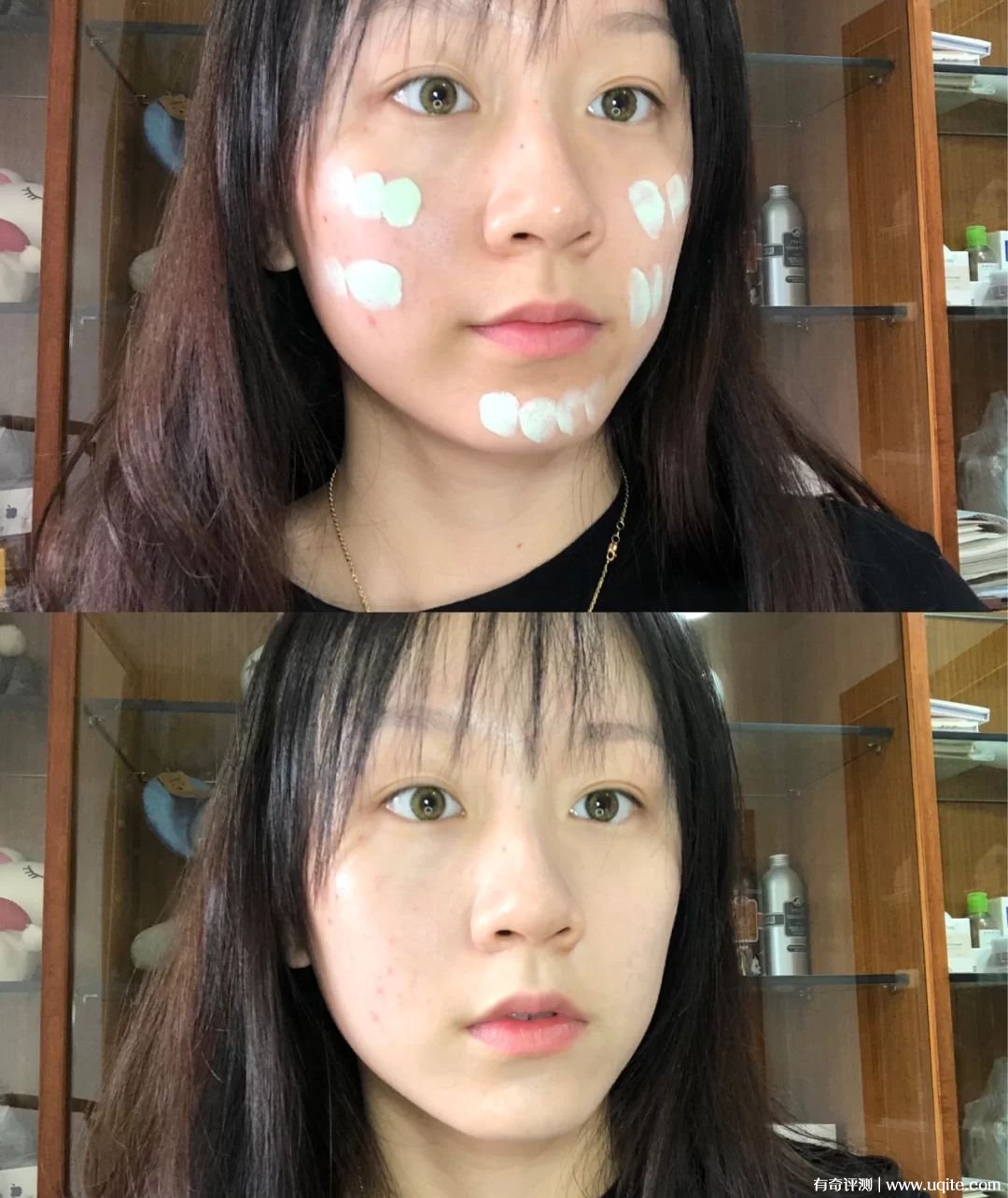 歐果隔離霜遮暇還不錯,我臉上有些痘印和泛紅,痘印能遮個五成左右,泛紅也被遮住了。它本身增白效果也很自然,通透不假白。就單獨用它,持妝也挺久的,不定妝一天下來,就T區(qū)看著有點脫妝,整體還是透亮的,所以我一般用了它再撲個散粉,就能撐一天了。用做妝前打底也挺好的,粉底液抓得很牢,也更容易上妝。