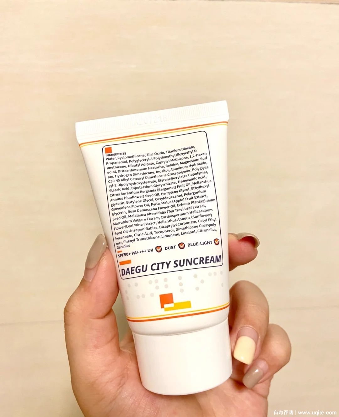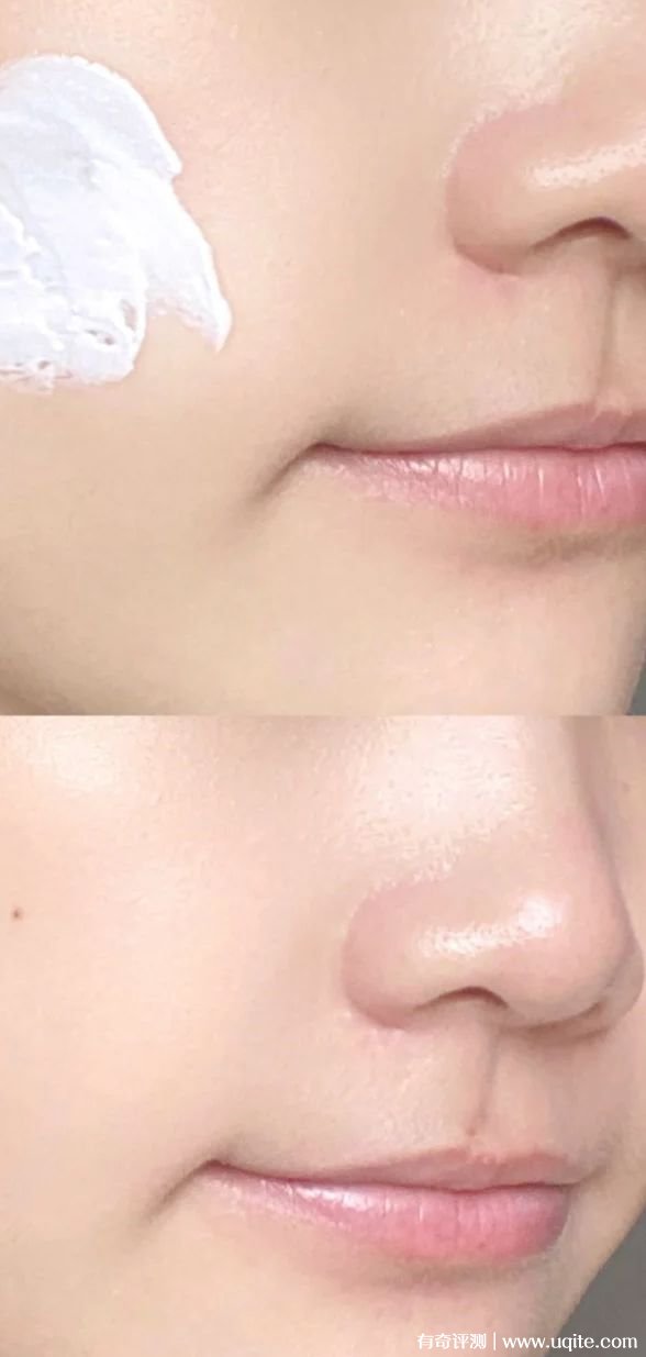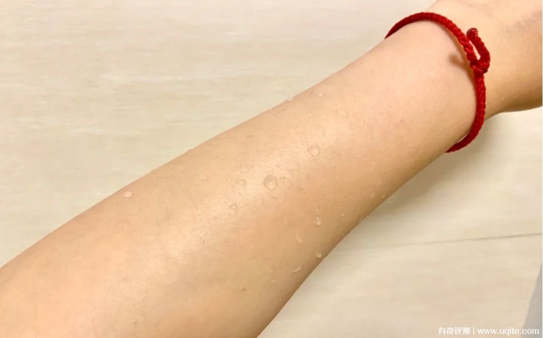 它因為是物理防曬,有增白效果,但不是很白的那種,就能均勻下膚色,遮點暗沉,蠻自然的,不假白。防水效果確實不錯,遇水皮膚上掛的是水珠狀的。