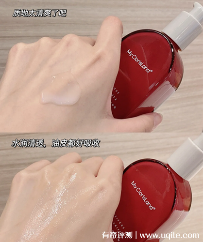上臉涂抹時(shí),這款花皙蔻水乳的味道還挺好聞的,有一股很清淡的花香氣息,而且精華水是透明的流動(dòng)性液體質(zhì)地,使用之后補(bǔ)水效果很高,吸收速度也很快。精華乳雖然是白色乳液的質(zhì)地,但是上臉推開之后有一抹化水的效果,并且不厚重粘膩,輕輕按摩幾下就能被吸收,有滋潤(rùn)亮膚的效果。