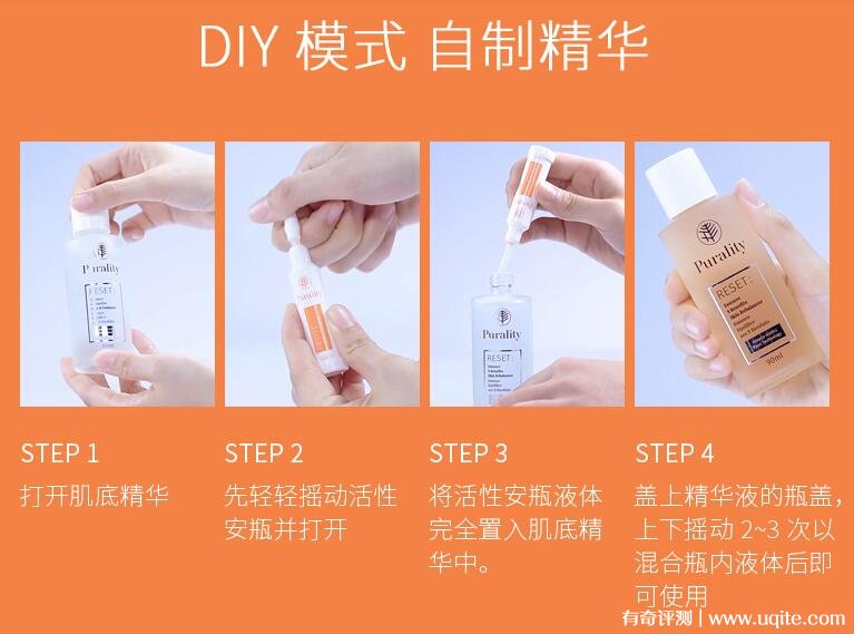 Purality小橘?gòu)椌A用的時(shí)候是需要混合使用的,用法也簡(jiǎn)單,將活性安瓶加到肌底精華里面混合均勻就可以使用了。它的質(zhì)地很水潤(rùn),流動(dòng)性還蠻強(qiáng)的,上臉不厚重,也不油膩,還蠻好吸收的,抹開之后拍拍就差不多的,用完之后皮膚有種水潤(rùn)感,保濕效果也不錯(cuò),我晚上就涂它,隔天起來(lái)皮膚已經(jīng)軟嫩。