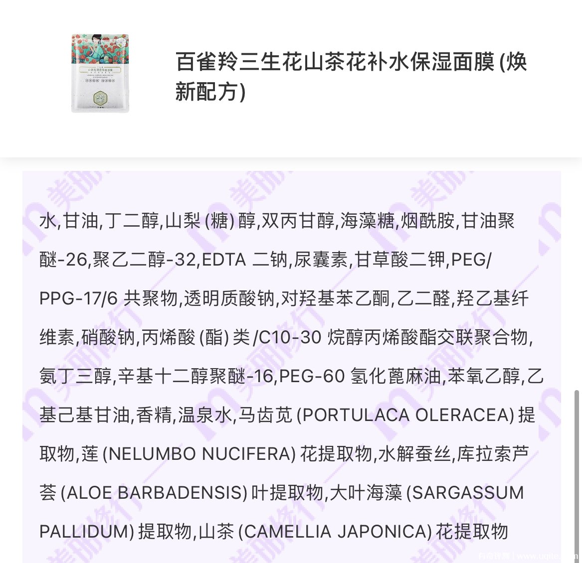 百雀羚三生花面膜到手之后分量還蠻足的,它打開之后的味道挺淡的,聞著不刺激,用著很溫和,我也查了一下它的成分,還蠻溫和安全的沒有添加什么刺激性的成分,敏感肌用也ok。